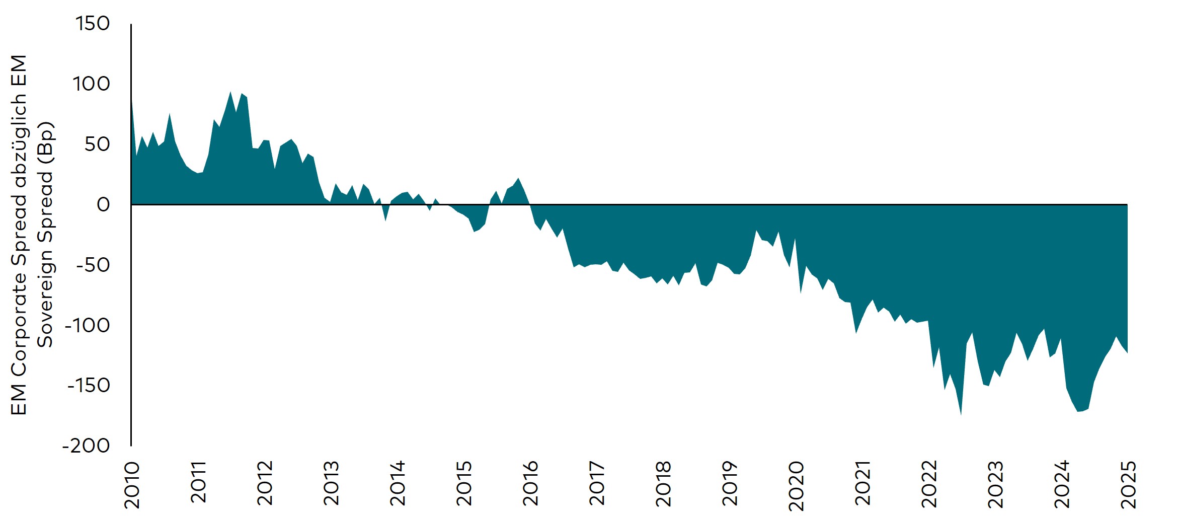 Aufgrund größerer Spread-Rückgänge und kürzerer Duration haben sich EM-Unternehmensanleihen seit 2022 besser entwickelt als Staatsanleihen. EM-Staatsanleihen werfen daher heute – was ungewöhnlich ist – höhere Renditen ab als Unternehmensanleihen, die zusätzlichen Risiken durch mögliche Zölle ausgesetzt sind. Außerdem sind EM-Staatsanleihen liquide, das Risiko plötzlich steigender Kreditrisiken ist geringer und die Rückgewinnungsquoten bei einem Ausfall tendenziell höher.