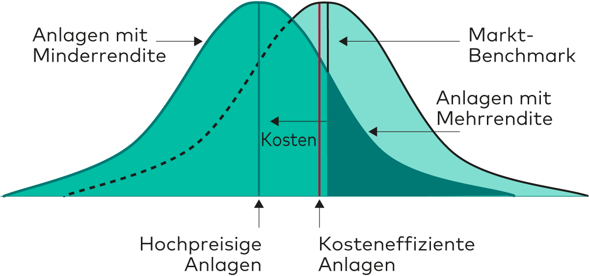 Die nachstehende Abbildung vergleicht zwei unterschiedliche Investments mit der Marktrendite: Das erste, kosteneffiziente Investment wird durch die rote Linie dargestellt, das zweite, hochpreisige Investment durch die grüne Linie. Die Renditen beider Anlagen verschieben sich nach links; die Zahl der Anlagen mit Mehrertrag sinkt also, wobei sich jedoch das hochpreisige Instrument deutlich stärker bewegt. Mehrrenditen sowohl im Vergleich zum Markt als auch gegenüber dem kostengünstigen Indexfonds werden damit weniger wahrscheinlich. Anders ausgedrückt: Nach Abzug der Kosten ergibt die Summe der Mehrerträge aller Anlegerinnen und Anleger nicht länger null, und je höher die Kosten ausfallen, desto größer wird der Fehlbetrag.