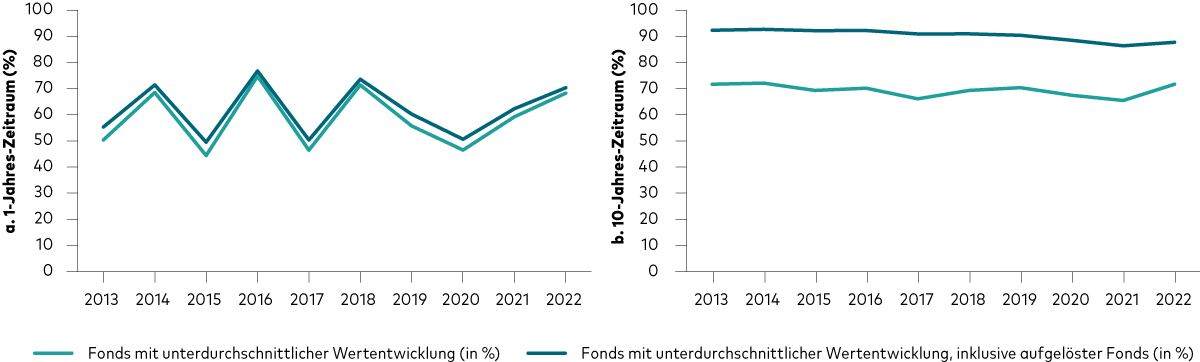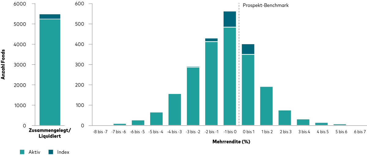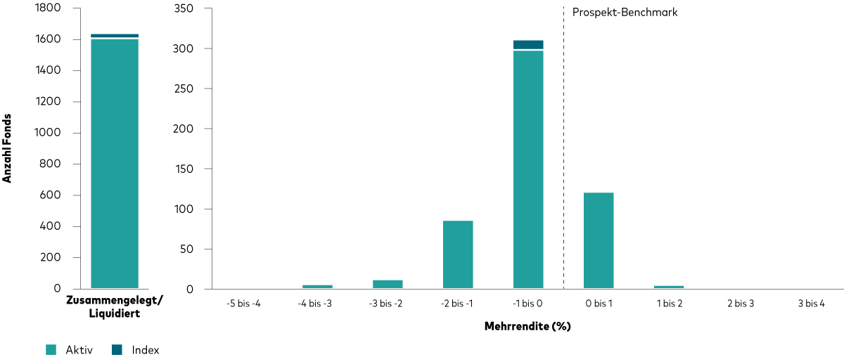 Hinweise: Die Performance wird im Vergleich zu der im Prospekt angegebenen Benchmark des Fonds berechnet. Aufgelöste Fonds wurden während des Untersuchungszeitraums entweder mit anderen Fonds zusammengelegt oder liquidiert. Die Definition des Fondsuniversums und der Kategorien ist mit derjenigen in der Abbildung oben „Verteilung der Mehrrenditen bei Aktien- und Anleihenfonds“ identisch. Wertentwicklung auf Basis des Nettoinventarwerts; Renditen in EUR abzüglich Gebühren bei Wiederanlage der Erträge.