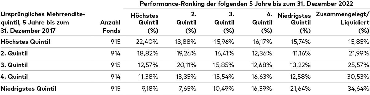 Hinweise: In der ersten Spalte sind alle aktiven Aktienfonds entsprechend ihrer Mehrrendite gegenüber der im Prospekt angegebenen Benchmark für den Fünf-Jahres-Zeitraum per angegebenem Datum kategorisiert. Die anderen Spalten geben an, wie sich diese Fonds in den folgenden fünf Jahren entwickelt haben. Wertentwicklung auf Basis des Nettoinventarwerts, Renditen in EUR abzüglich Gebühren. Die Definition des Fondsuniversums und der Benchmarks ist mit denjenigen in Abbildung 3 und im Anhang identisch.