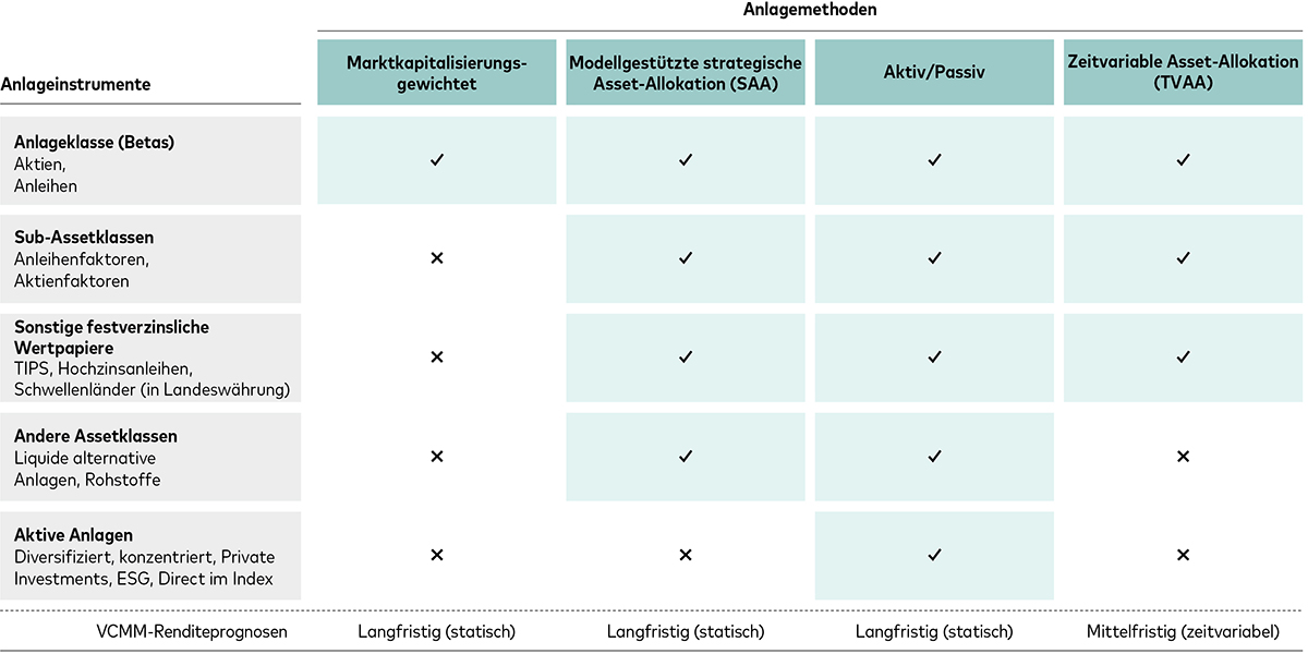 Bei der modellgestützten strategischen Asset-Allokation verwenden wir selbst entwickelte Modelle, um diversifizierte Betas mit einer Übergewichtung bestimmter Sub-Assetklassen zu kombinieren, zum Beispiel Value-Aktien, langfristige Staatsanleihen oder Indizes für Unternehmensanleihen. Diese Methode lässt sich auch auf Assetklassen außerhalb der Aktien- und Anleihen-Betas anwenden, zum Beispiel auf Rohstoff-Futures, inflationsgeschützte Staatsanleihen (Treasury Inflation-Protected Securities, TIPS) oder High-Yield-Anleihen. Das Ergebnis sind modellgestützte strategische Portfolios, die explizite Renditeprognosen für die einzelnen Assetklassen, Faktorprämien und die damit verbundenen Faktorrisiken voraussetzen, welche sich beispielsweise aus dem VCMM ableiten lassen. Das zweite Modell, das Vanguard Asset Allocation Model (VAAM), strebt zur Bestimmung der optimalen Allokation (Portfoliogewichtung) ein Gleichgewicht der Risiko- und Renditeprognosen des VCMM und der Faktorrisiken bzw. -prämien an.