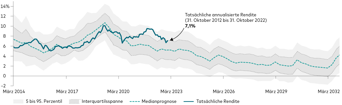 Hinweise: Das Diagramm zeigt die realisierte annualisierte 10-Jahres-Rendite eines Portfolios, das zu 60% aus globalen Aktien und zu 40% aus währungsgesicherten globalen Anleihen besteht, im Vergleich zu den zehn Jahre zuvor erstellten VCMM-Prognosen. Ein Beispiel: Die Daten vom März 2014 am linken Rand zeigen die realisierte Rendite für den 10-Jahres-Zeitraum vom 31. März 2004 bis zum 31. März 2014 (durchgezogene Linie) im Vergleich zur 10-Jahres-Renditeprognose vom 31. März 2004 (gestrichelte Linie). Die gestrichelte Linie läuft nach dem September 2022 weiter und zeigt an, wie sich unsere Prognosen zwischen dem 31. Dezember 2012 und dem 30. September 2022 (die zwischen dem 31. Dezember 2022 und dem 30. September 2032 enden) entwickeln. Die Interquartilsspanne (dunkelgrau schraffierter Bereich) stellt den Bereich zwischen dem 25. und 75. Perzentil der Renditeverteilung dar, die hellgrau schraffierte Spanne den Bereich zwischen dem 5. und 95. Perzentil.