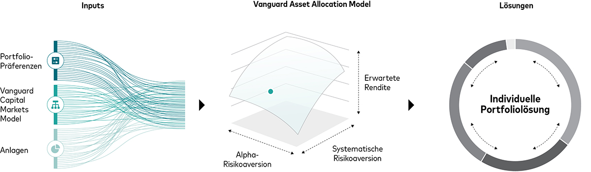 Zweitens überträgt das VAMM das Vanguard Modell zum Portfolioaufbau auf eine digitale Technologieplattform, sodass sich Portfolios vollständig an die spezifischen Finanzziele und Bedürfnisse von Kundinnen und Kunden anpassen lassen und gleichzeitig die Skalierbarkeit und Kohärenz der dem Modell zugrunde liegenden Anlagemethodik über die verschiedenen Portfoliolösungen hinweg gewährleistet sind.