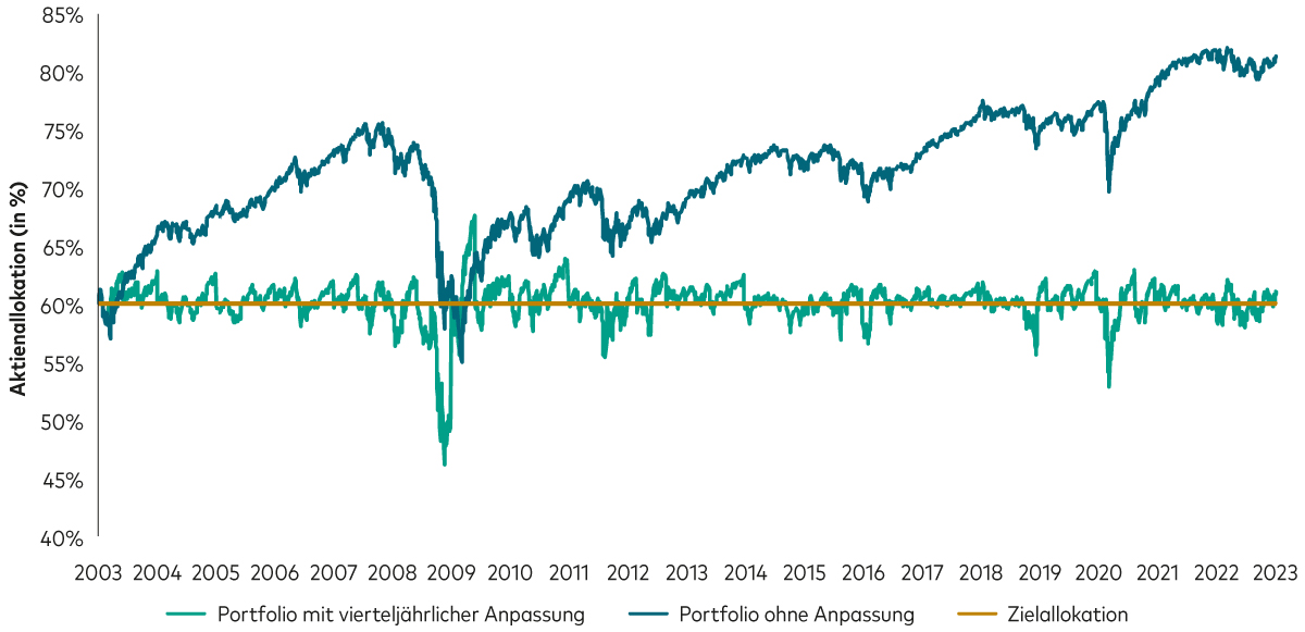 Das nachstehende Diagramm verdeutlicht dies am Beispiel eines hypothetischen 60/40-Portfolios: Ohne Rebalancing steigt der Aktienanteil des Portfolios von 60% im Jahr 2003 auf 80% im Jahr 2022. Setzt man dasselbe Portfolio dagegen regelmäßig jeweils am Quartalsende zurück, entspricht die Asset-Allokation beständig dem angestrebten Risikoprofil und der Zielstruktur.