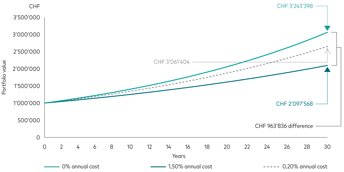 The hypothetical example below assumes an initial investment of CHF 1,000,000 is held over 30 years at a 4% annual rate of return, reinvested. Over 30 years, the difference between a 0.20% and 1.50% cost on returns is stark: paying 1.3 percentage points less in portfolio fees can improve portfolio returns over 30 years by almost CHF 1 million.