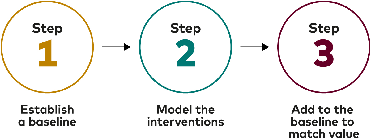 To assist you in using our new framework, Vanguard has developed a three-step process for measuring the value of a set of advice interventions for individual clients relative to their existing ‘baseline’ investment strategy. The process can also be used to discover higher-value advice opportunities that can assist clients in their decision-making2.