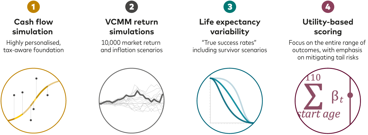 Distributional outcomes: The VFAM method explicitly values each possible outcome and weighs them appropriately. It also explicitly accounts for the variability of life-expectancy outcomes whereas most advice conventions project to a given age.
