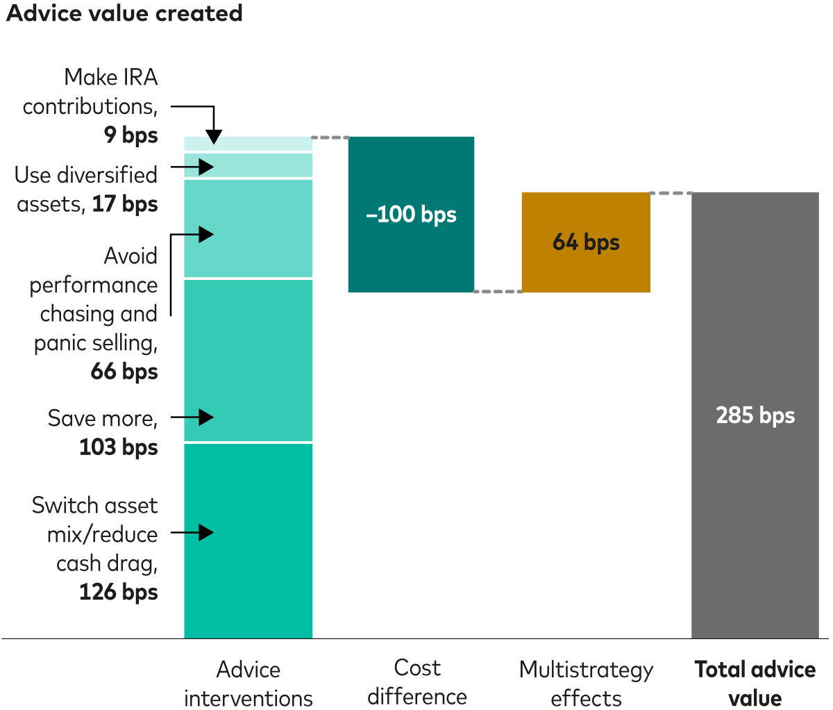 To calculate the value of a specific set of advice interventions, VFAM draws on the unique needs and goals of the individual client, taking into account the tax and regulatory landscapes of the client’s home market. The model’s results are primarily expressed in terms of the annualised return value provided to the individual investor, in basis points (a basis point is a hundredth of a percentage point), as well as in 'windfall equivalent dollars' — the amount that would need to be added to a taxable account held by the individual today — as an alternative measure.