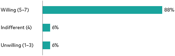 Question: On a scale from 1 to 7 where 1 means “not at all willing” and 7 means “extremely willing,” how willing are you to work with a human financial adviser in the future?