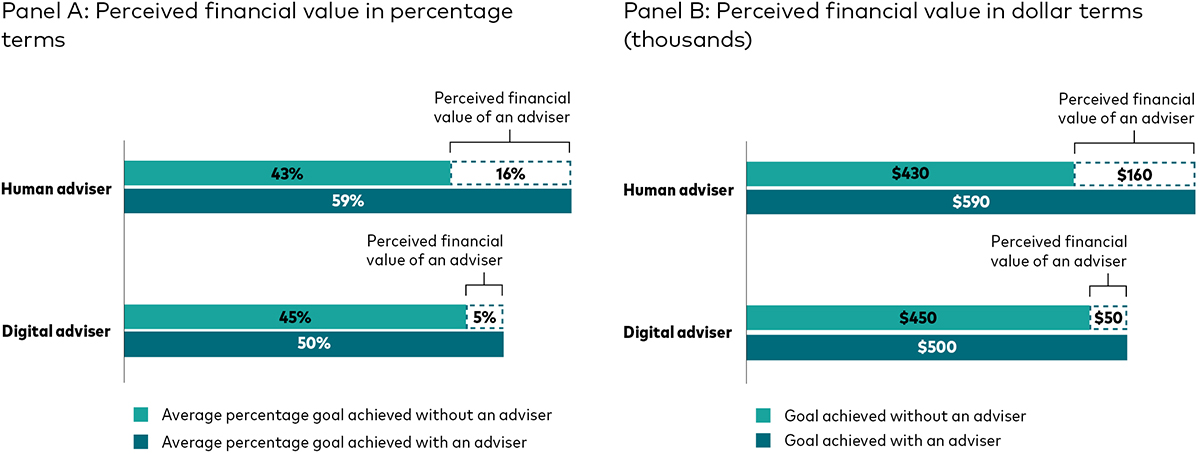 We find that human-advised clients believe they are $160,000 closer to achieving their financial goals while digital-advised clients attribute a more modest $50,000 to the advice they receive. Both human- and digital-advice clients believe that their advisers add substantial financial value in helping them achieve their goals.